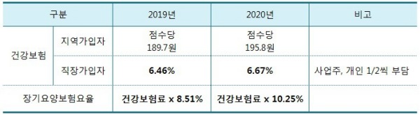 (건강보험 ={부과점수 X 195.8원} + 소득 최저 보험료, 장기요양보험료 = 건강보험료 X 10.25%)