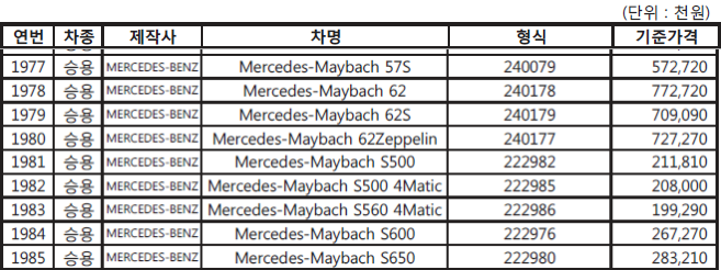 벤츠 마이바흐 S600L 중고차 기준 가격을 먼저 확인해야 하는데요. 기준 가격은 지자체에서 중고차 가격을 기준하여 참고하는 것입니다. (해마다 행정부 발행)